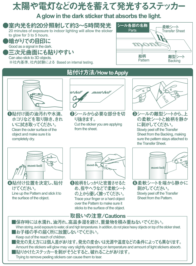太陽や電灯などの光を蓄えることで、暗い場所で自然に発光する特殊プリントを施した転写タイプのステッカーです。