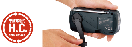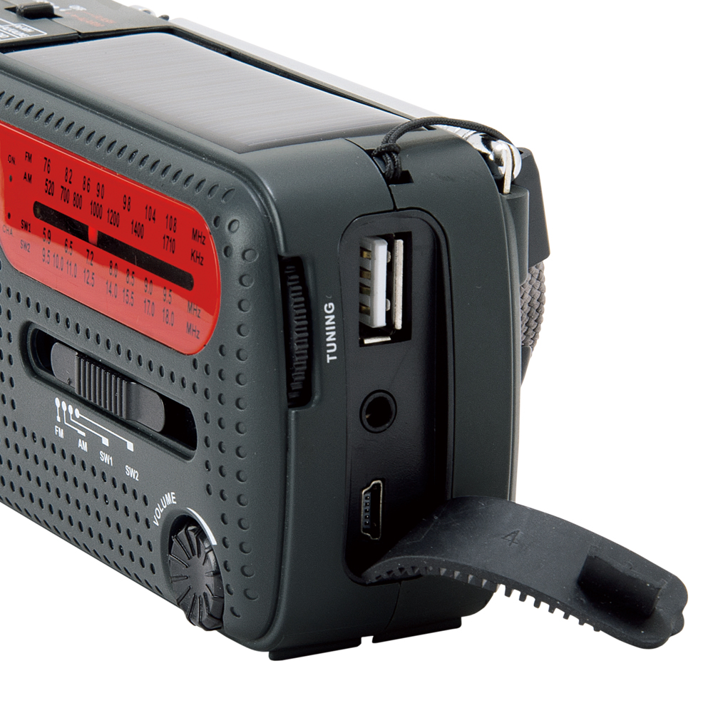 災害時やアウトドアでマルチに活躍するハンドチャージ充電ラジオです。ラジオはFM/AMに加え、ワイドFMと短波放送が受信可能。LEDライトやアラーム機能を備え、緊急時には外部バッテリーとしてモバイル機器への充電もできます。内蔵のニッケル水素電池と単4形乾電池3本を電源とし、内蔵電池へはUSB端子に加え、手回しハンドルと付属ソーラーパネルからも充電可能。電力の供給がない状況でも使用できます。
