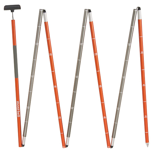 ラチェットボタン式で瞬時に組み立てができる軽量ゾンデです。インナーコードを引っ張ると自動的にラチェットボタンがロックされて伸長状態になり、煩わしい操作なしで組み立てができます。シャフト部分には10cm刻みの目盛りを付け、さらに雪中に差し込んだ際、一目で深さを判別できるよう、40cm間隔でアルミポールを色分けしています。