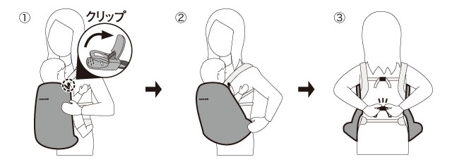 ①対面抱きでお子さまを抱っこします。本製品をかぶせ、クリップ上部を起こして開き、ショルダーハーネスに挟みます。