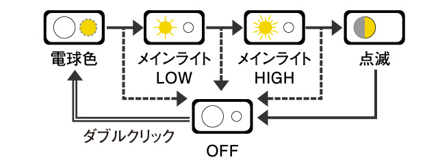 スイッチを押すごとに、電球色→メインライトLOW→メインライトHIGH→点滅の順序で、点灯モードが切り替わります。