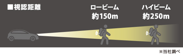 【視認距離】車のロービーム:約150m、ハイビーム:約250m