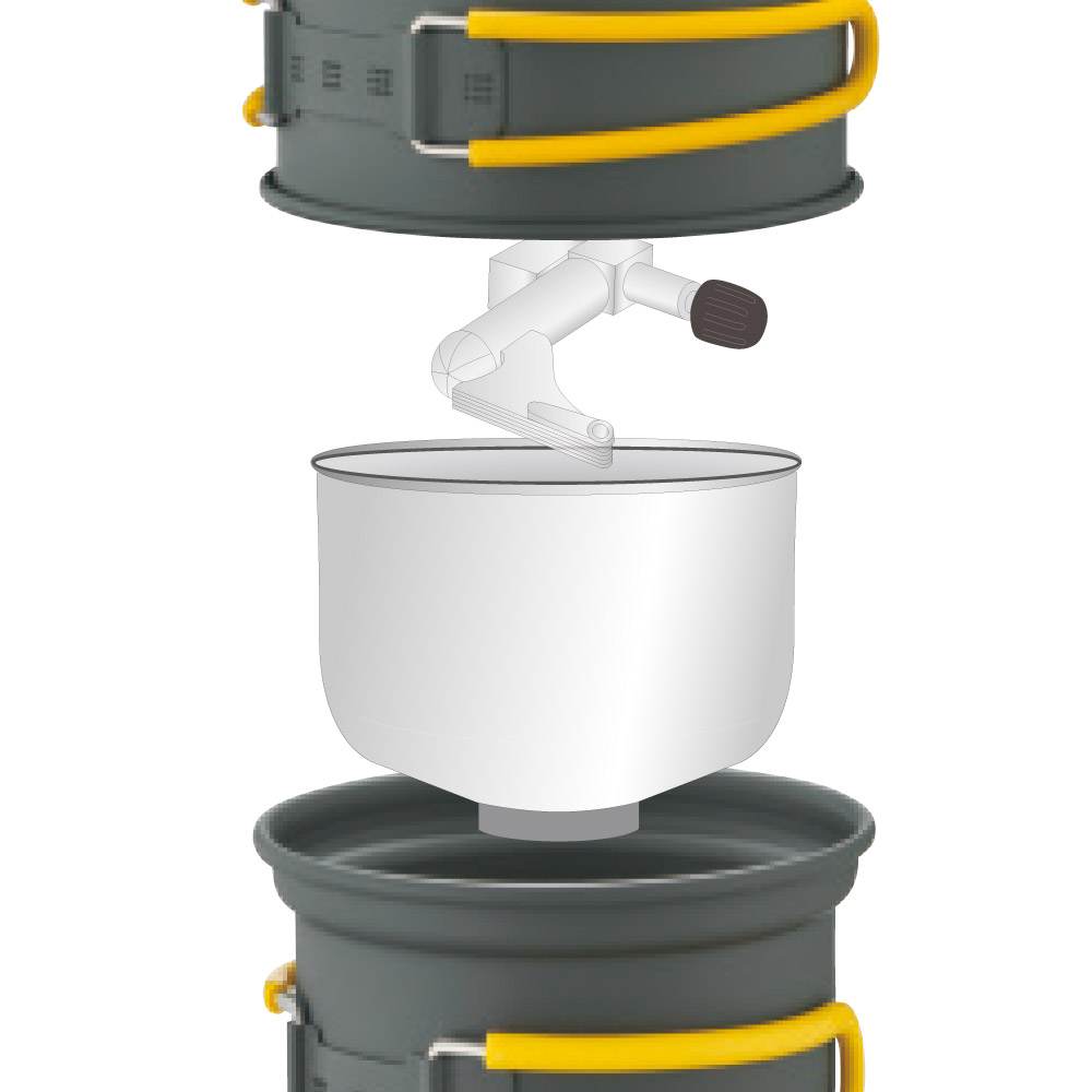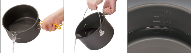 お湯や汁物を、器に注ぎやすい形状です。アルパインクッカー18・20は吊りハンドルと片側のハンドルでより注ぎやすく、たき火にかける際にも便利です。調理のしやすさにもこだわり、クッカーの内側には目盛りを設けています。