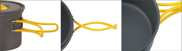 調理時に熱くなりにくく、手袋を着けたままでも滑りにくいシリコーンカバー付きハンドル。ハンドルを交差させることで安定感を高めることができます。リベットを使用せずにハンドルを取り付けることにより、内側に凹凸がなく洗いやすくなっています。