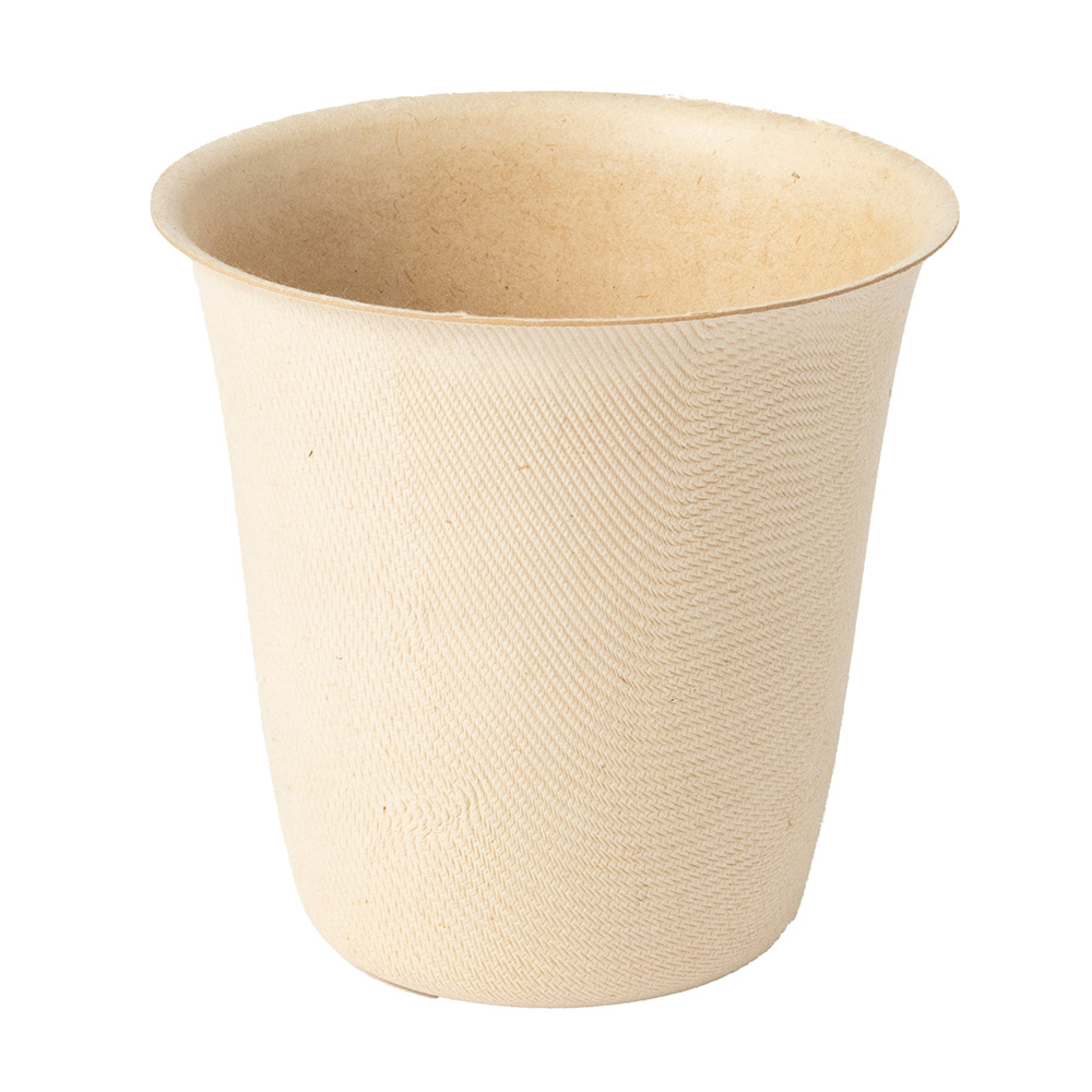 サトウキビの搾りかすと竹の繊維を原料とした使い捨ての紙容器です。コーヒーやお茶、ビールなどの飲み物用の湯呑み形状。一般的に使い捨て容器に使用されるPFAS(有機フッ素化合物)はつ油剤を使用しておらず、原料と共に環境に配慮した商品です。