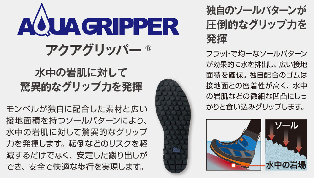 アクアグリッパー(ラバー):モンベルが独自に開発したアウトソール「アクアグリッパー」は濡れた岩に対してグリップ力が高いのが特長です。反面、ぬめりのある水垢やコケに対しては滑りやすいので注意が必要です。