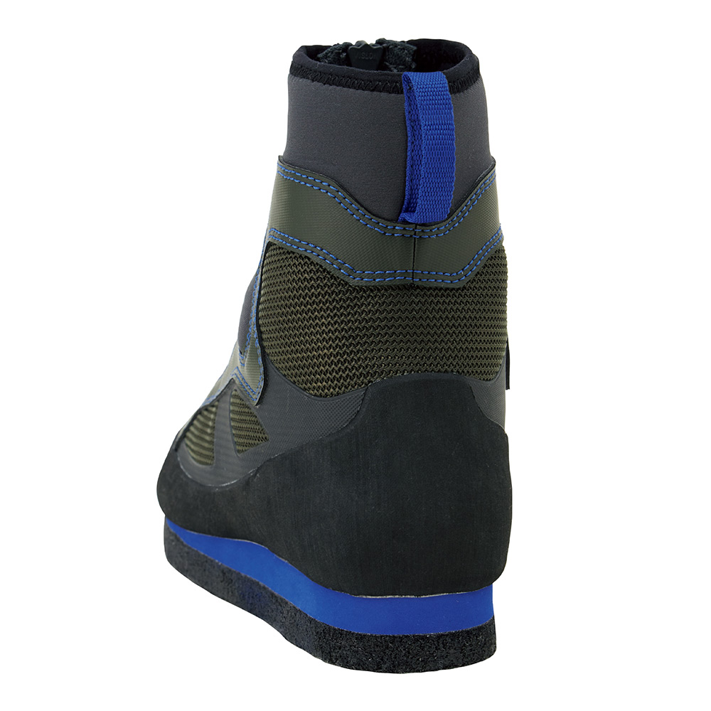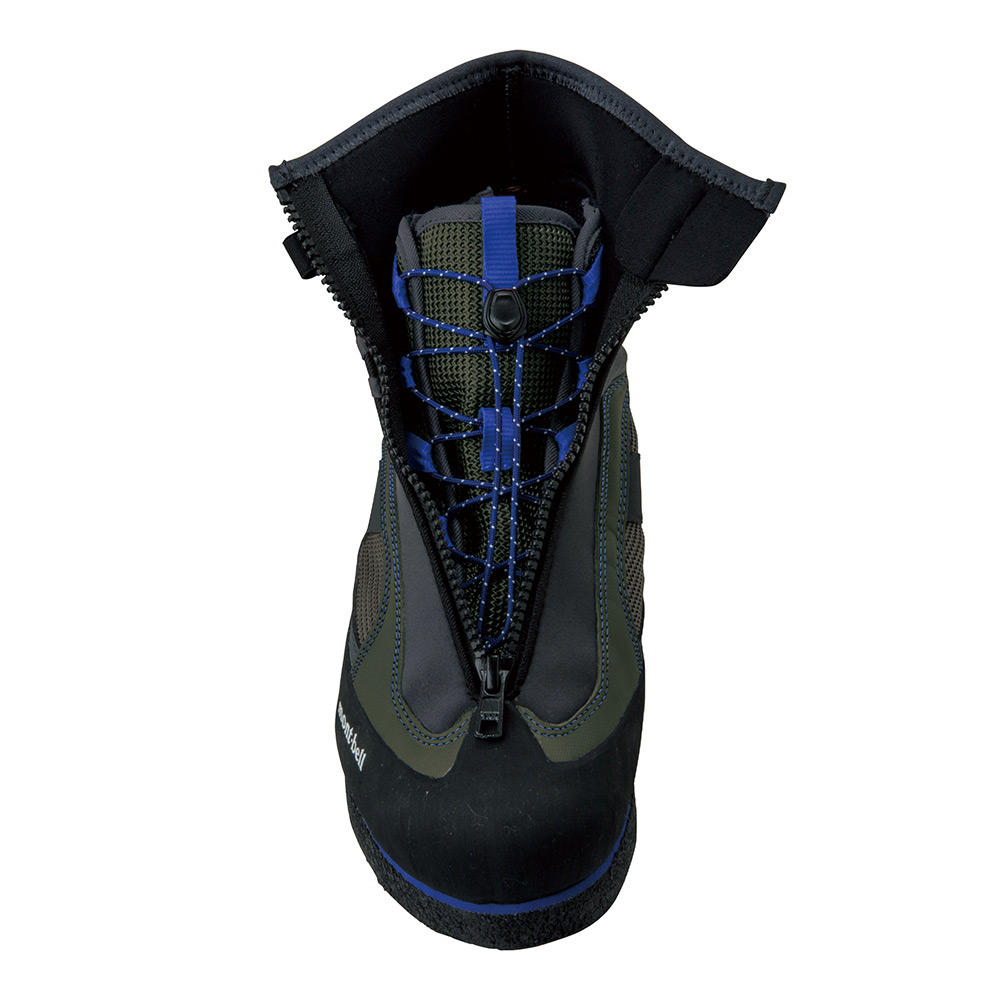 アウトソールには、コケやぬめりに強いポリプロピレン製フェルトを使用しています。靴ひもは締めやすいコードロック仕様のモデルです。足首のスパッツと一体化したレースカバーにより、余ったコードのひっかかりや損傷を軽減します。