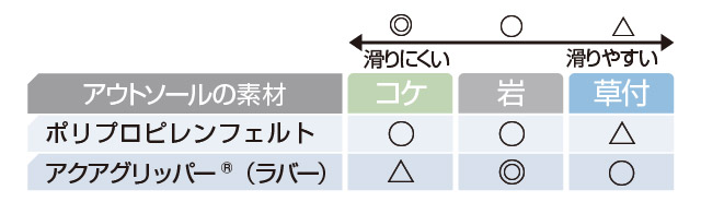 ポリプロピレンフェルト:水を含みにくい素材で、ぬめりのある水垢やコケなどに対して優れたグリップ力を発揮します。反面、草付きの斜面や泥の上などでは滑りやすいので油断は禁物です。