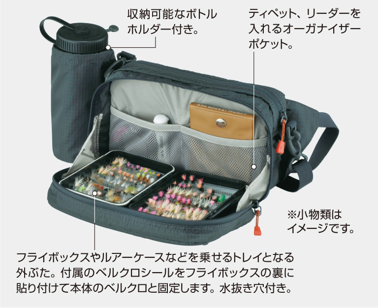 軽量性と耐久性に優れた生地を使用し、多彩な収納性を備えたタックルポーチです。外ぶたは大きく開き、トレーとしてフライボックスやルアーケースを乗せたまま作業が可能。収納できるウエストベルトと取り外し可能なショルダーストラップを併用して、体にフィットさせることができます。取り外し可能なショルダーストラップが付属します。