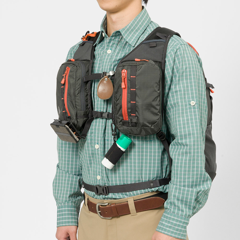 【特長】前面に釣り道具の出し入れがしやすいチェストポケット / サイドストラップ / ワンドポケット / ランディングネットホルダー / トレールウォーターパック対応