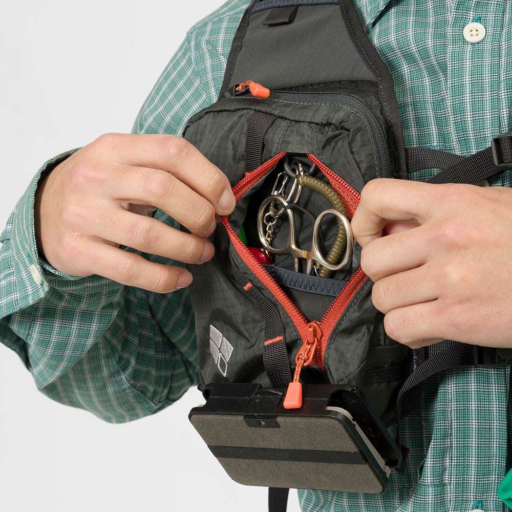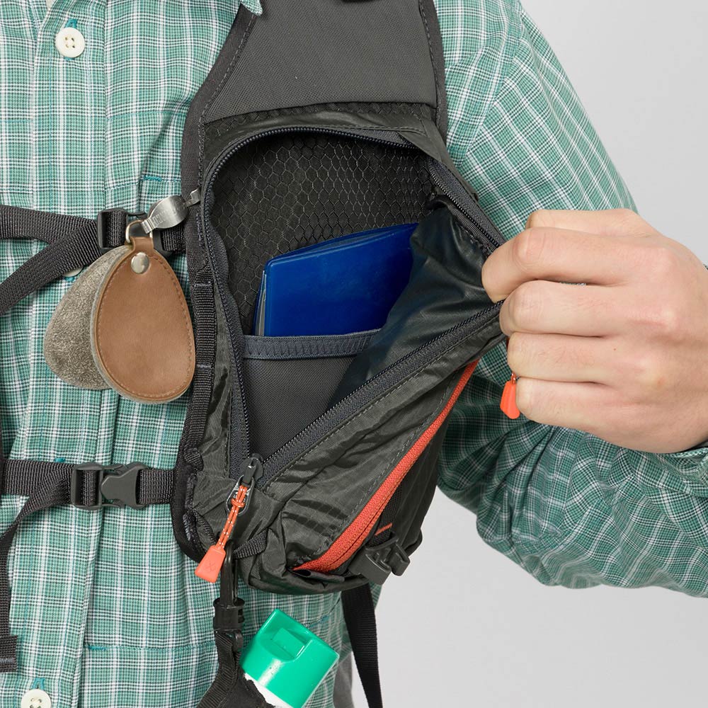 G: アクセスしやすい左右のショルダーハーネスにはフライボックスやルアーケースを収納できる大型ポケットを装備。