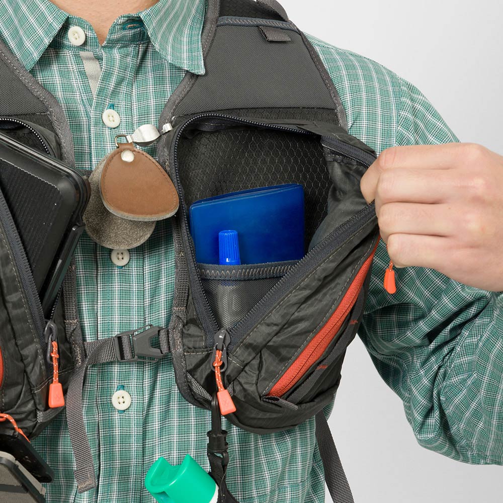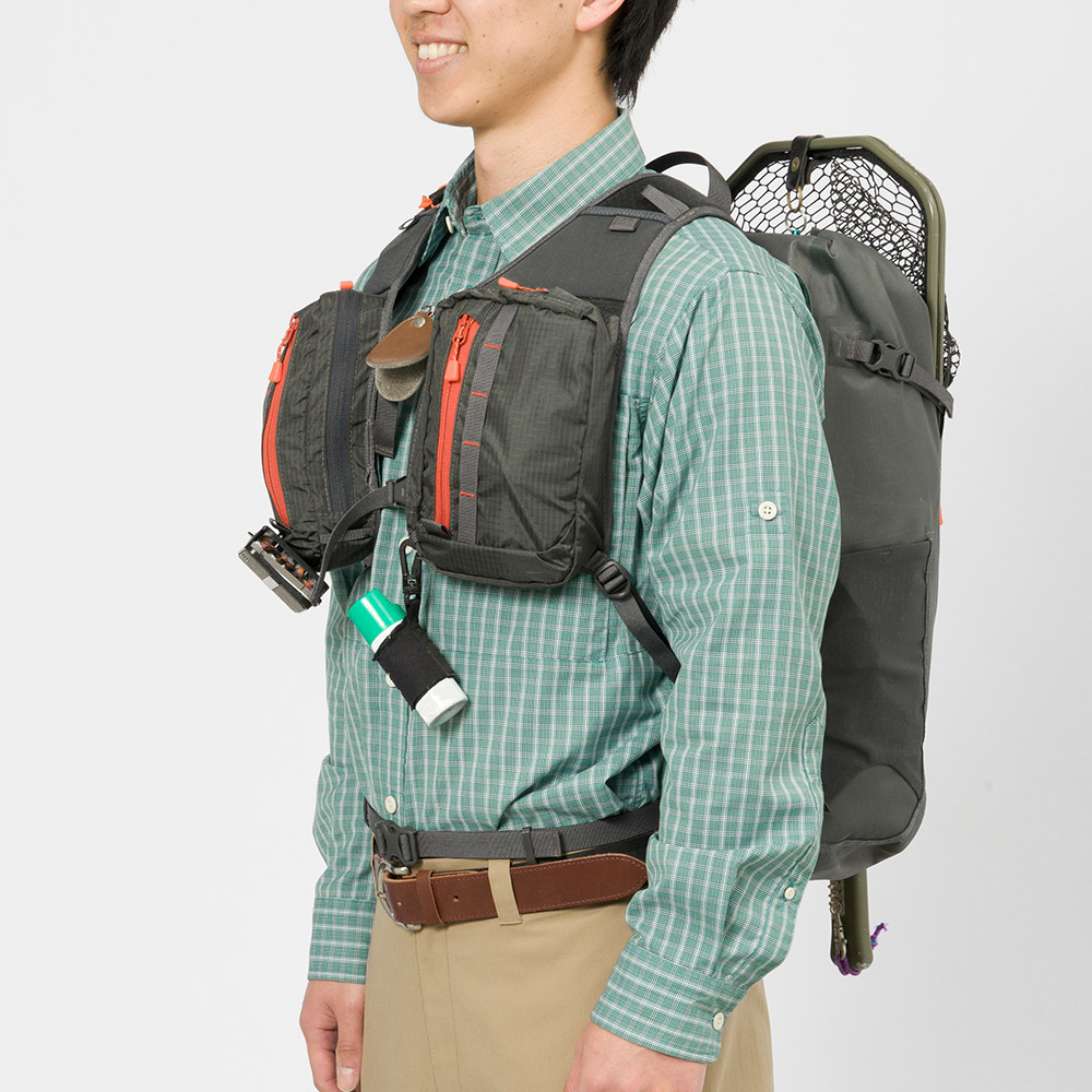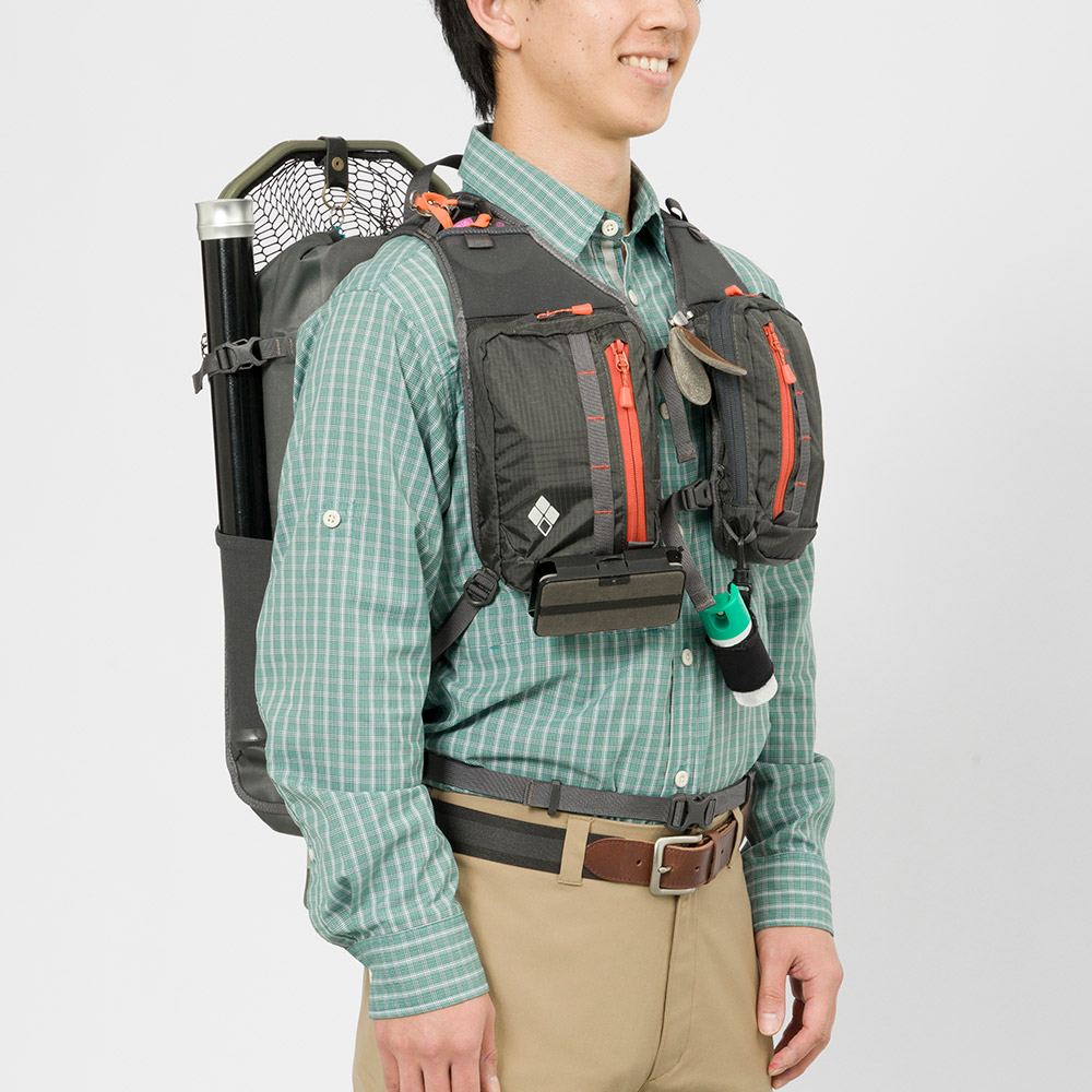 【特長】背面にアクアテクト®ジッパーポケット / 前面に釣り道具の出し入れがしやすいチェストポケット / サイドストラップ / ワンドポケット / ランディングネットホルダー