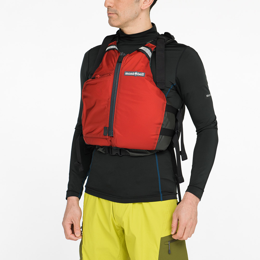 モンベルのライフジャケットは、カヤックやカヌー、ラフティング用に開発されたベストであり、海難救助用の救命胴衣とは規定・使用目的が異なります。ご留意の上、添付の説明書をよく読んでご使用ください。
