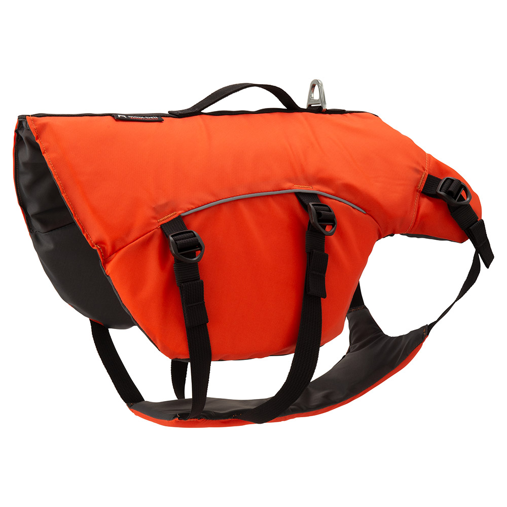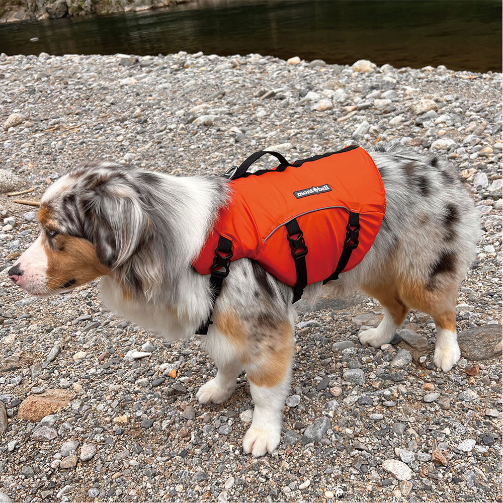 水遊びやカヌーを楽しむための犬用ライフジャケットです。高性能なフォームを犬の体のラインに合わせて立体パターンで構成し、水中でも動きを妨げません。圧迫感が少なく、胴囲が小さい犬にもフィットしやすくなっています。側面には反射テープがついています。水から引き上げるときに便利なハンドルを背面に設けています。