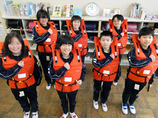 東日本大震災の教訓を生かして開発した、クッション型ライフジャケット「浮くっしょん」をモンベルクラブ・ファンドを通じて提携している自治体へ寄贈しています。寄贈するのは子ども用サイズで、小学校などの教育施設に常備し、津波や浸水などの災害発生時に、子どもたちの安全確保に役立てていただくことを目的としています。