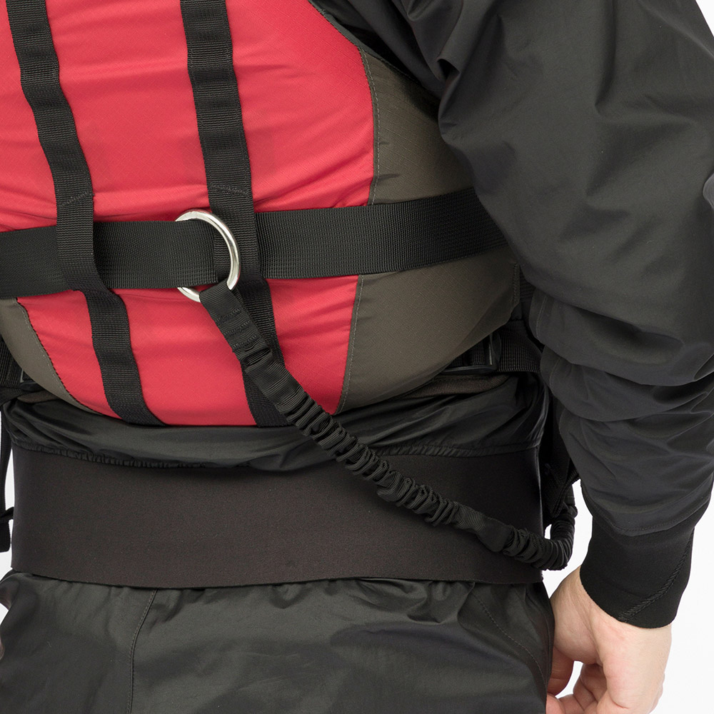 他の艇やパドルを回収するためのレスキューギアです。ライフジャケットのレスキューベルトに装着しやすく、カラビナの付いたテープとそのテープを収納するためのケースがついています。テープが伸縮してけん引時のショックを吸収します。レスキューベルトがないライフジャケットの場合は別売のトウイングライン用ベルト(#1127591)に装着できます。