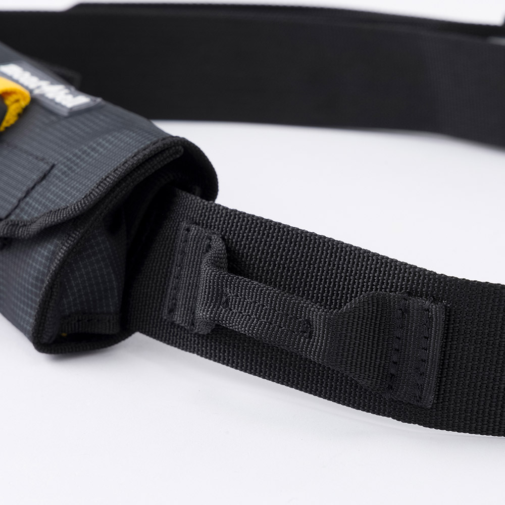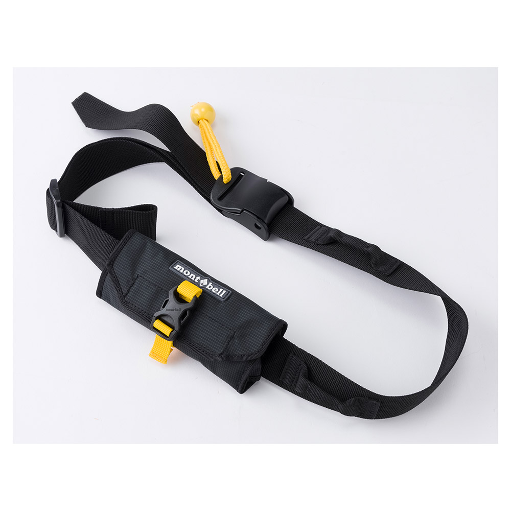 他の艇やパドルを回収するためのレスキューギアです。ギアラック付きのウエストベルトにカラビナの付いたテープとそのテープを収納するためのケースがついています。けん引中、レスキュー対象がスタックした場合などに、二重遭難を防ぐため、ベルト自体を素早く外せるクイックリリースバックルが付いています。