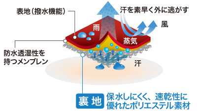 一般的なポリウレタン防水素材の特徴である、防水性を高めると透湿性が低下するという問題を非常に高いレベルで解決した、モンベル独自開発の防水透湿性素材です。雨を防ぎながら、汗の水蒸気をスムーズに外に逃がします。生地表面にははっ水加工を施しています。