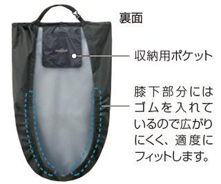 車椅子に乗った際に、脚部の濡れや汚れを防ぐレッグカバーです。太ももまでを覆う長さなので、さまざまなレインジャケットと組み合わせて使用できます。携行に便利なポケッタブル仕様です。