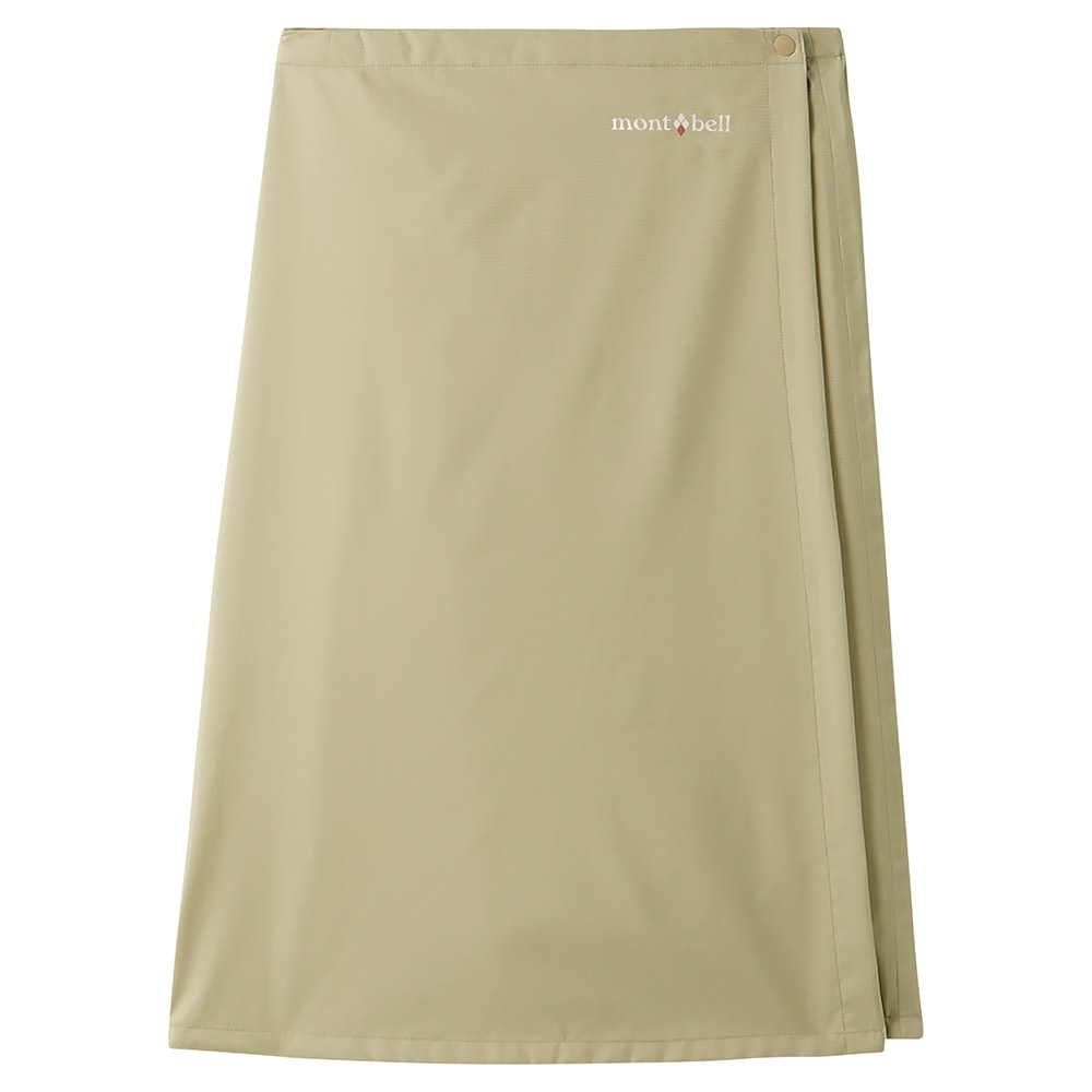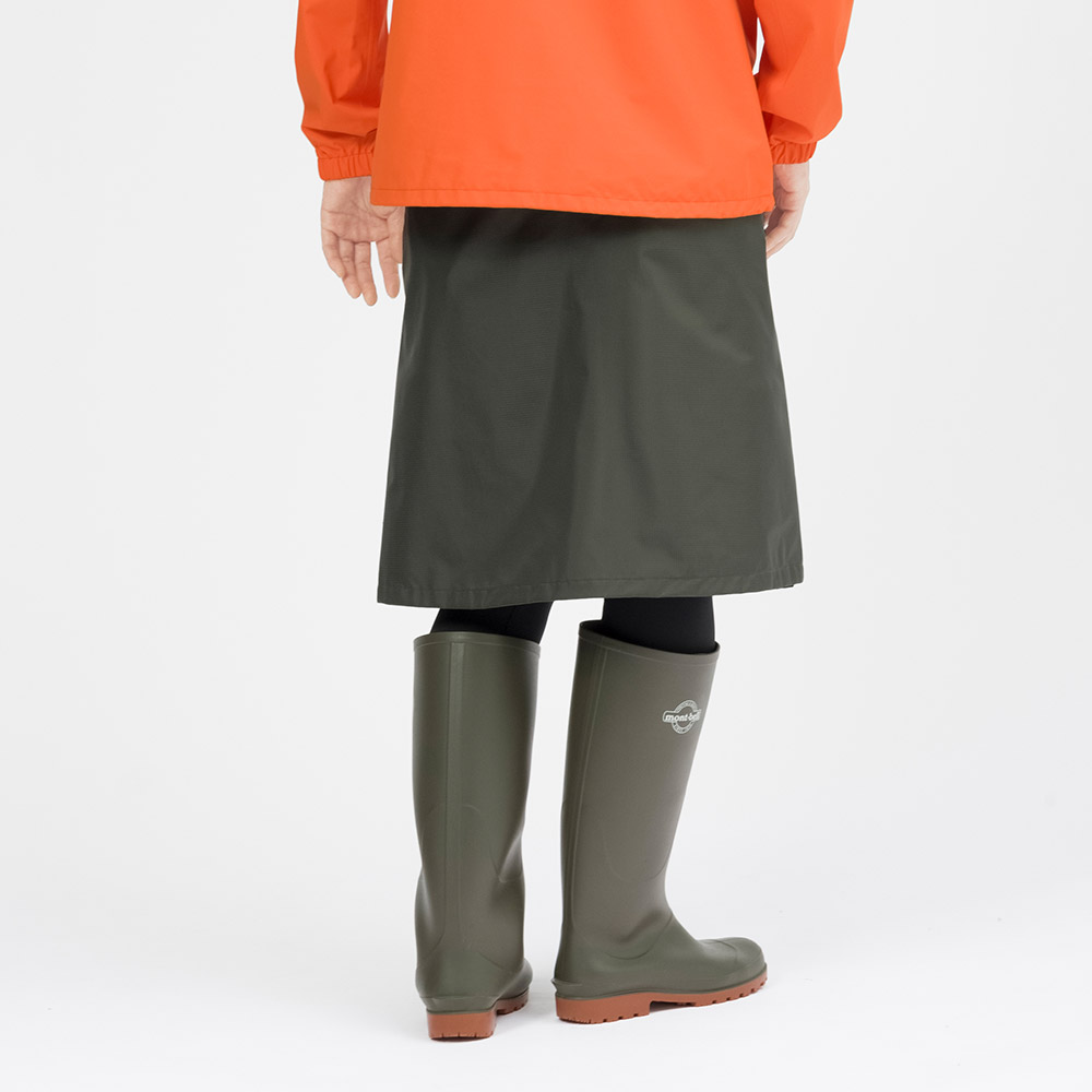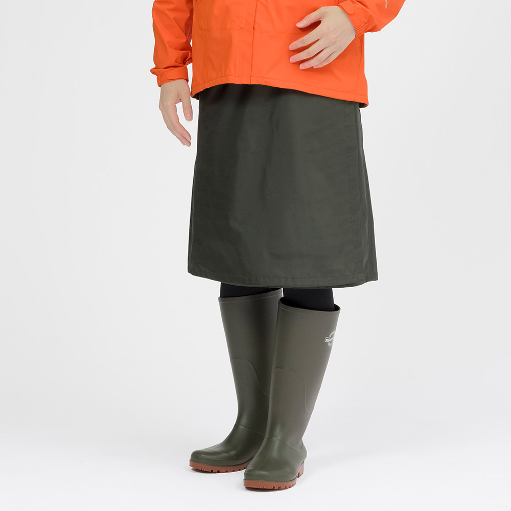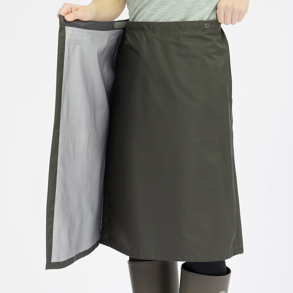 防水透湿性素材を使用し、防寒・防風効果も備えた膝下丈の全天候型巻きスカートです。濡れた場所に座る際に腰に巻いたり、不意の雨のときに広げて荷物にかぶせたり、ガーデニング時のエプロン代わりに使用するなど、幅広いシチュエーションで多用途に活躍します。ウエストはゴム入りで優しくフィットし、ホックによる2段階のサイズ調節が可能。