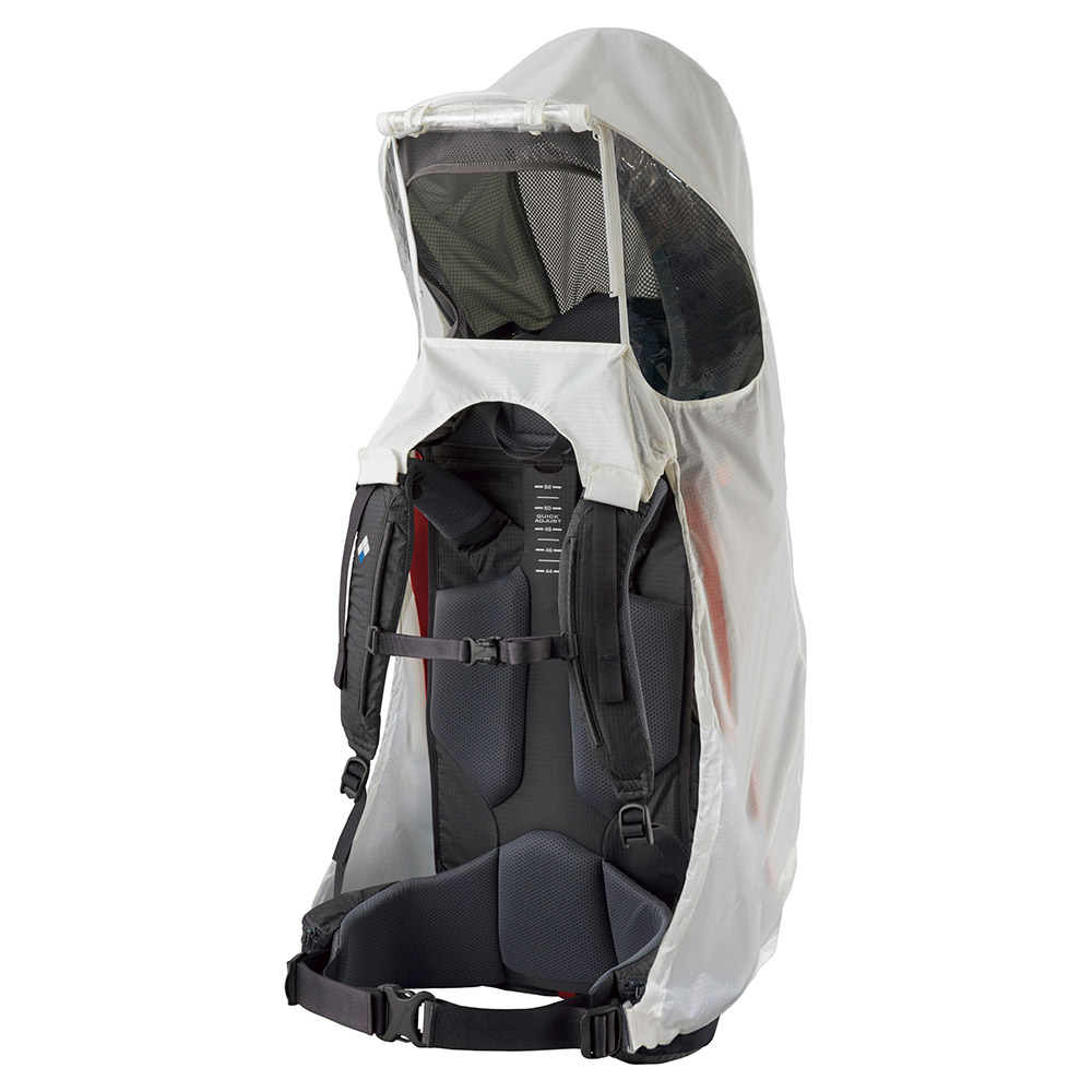 ベビーキャリア使用時、「ベビーキャリア サンシェイド(別売)」の上から被せることで、お子さまを雨や風から守るレインカバーです。前面が透明なので、お子さまの視界を広く確保します。前面はジッパーとトグルで開閉できる仕様です。※完全防水ではありません。