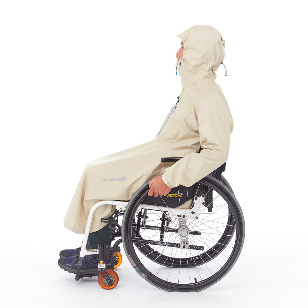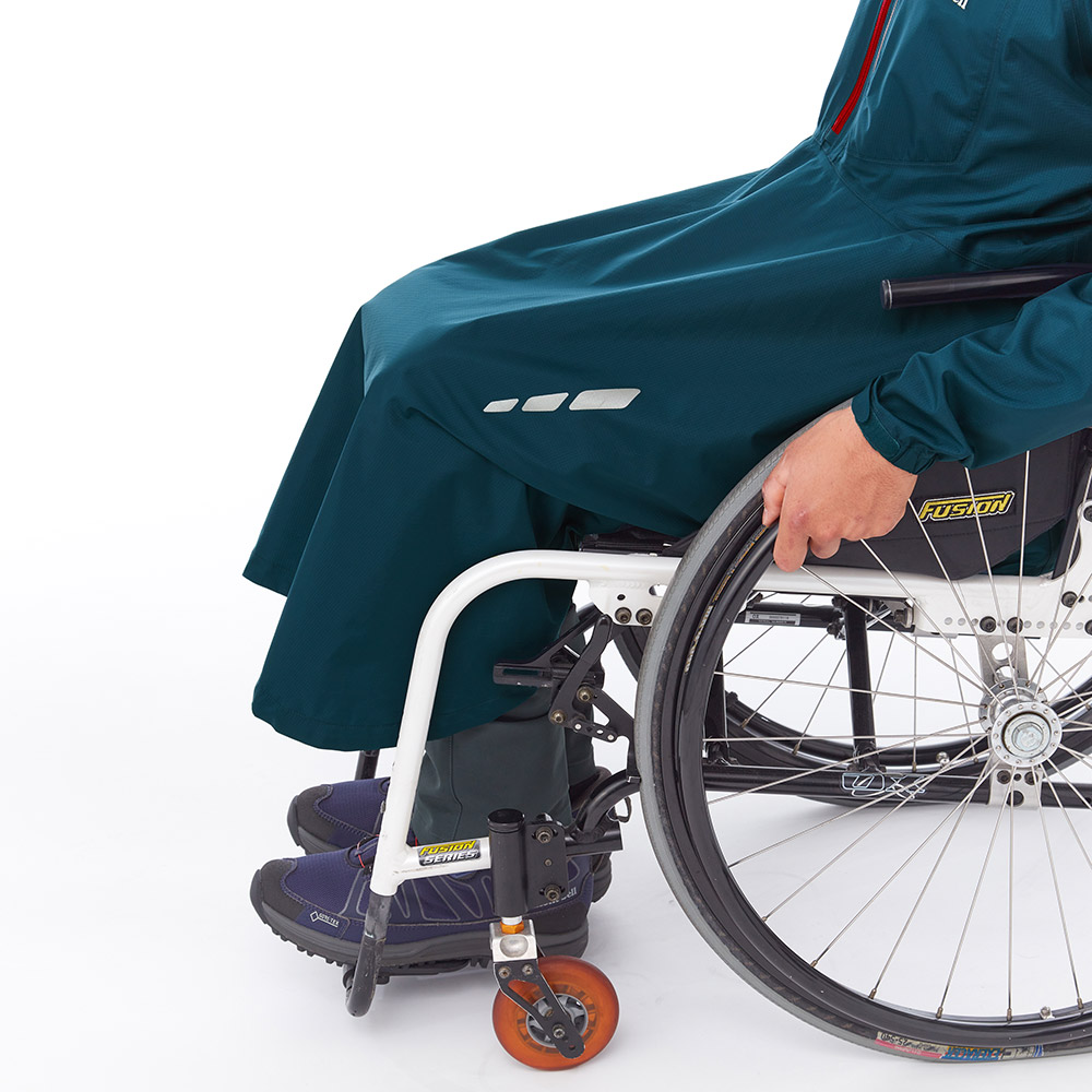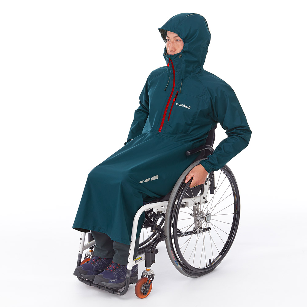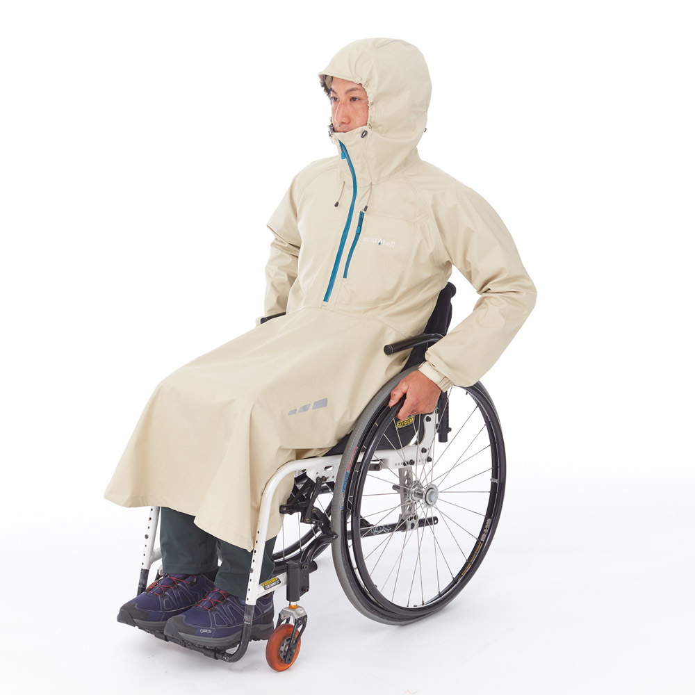 モンベル独自の防水透湿性素材ドライテック®を使用した、機能的な車椅子用のレインウエアです。座った姿勢に合わせたパターンで裁断することで、膝に雨水が溜まりにくくなっています。