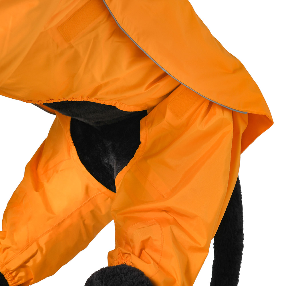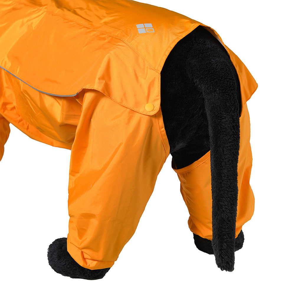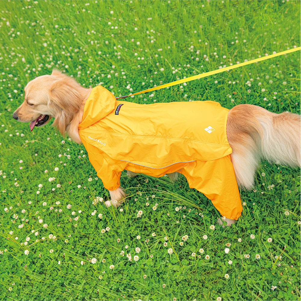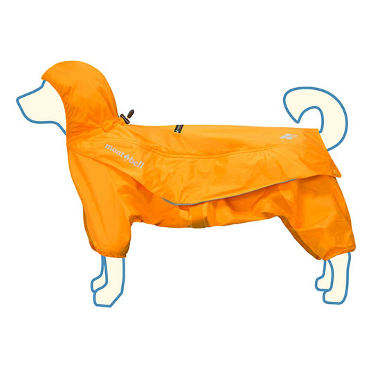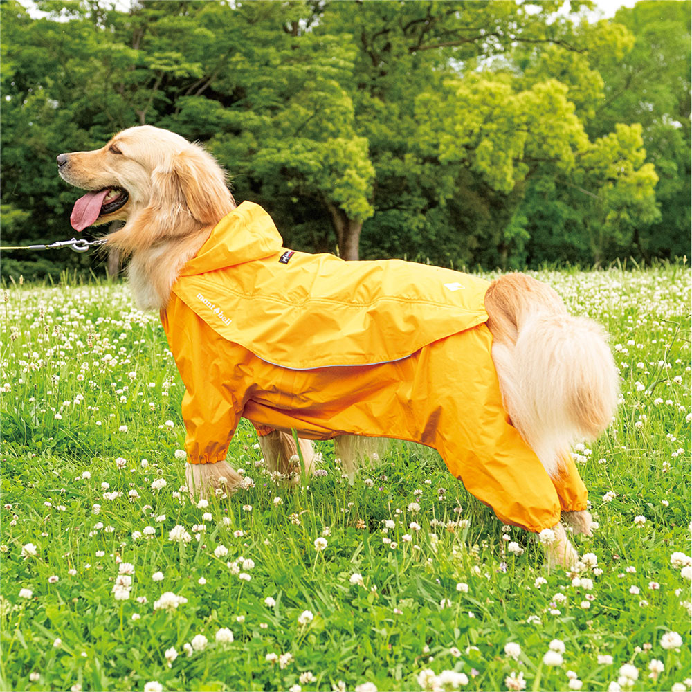 雨や泥から愛犬を守るフルレインスーツです。首回りはドローコードで、胴回りはベルクロでフィット感を調節できます。オスでも用足しが行えるよう下腹部から尻尾にかけては生地が開いた状態になっています。背面首元にリーシュを通せる穴があるため、カラー(首輪)の上から着用できます。夜間のお散歩でも安全な反射マーク付き。収納袋付き。