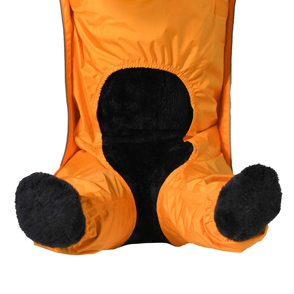 本製品を首、前脚、後脚の順で通します。首はドローコードで調節します。側面のジッパーを閉め、ベルクロで胴回りのサイズを調節します。
