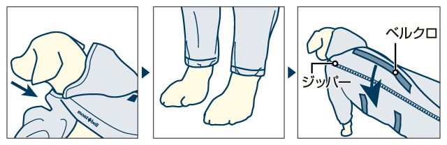 本製品を首、前脚、後脚の順で通します。首はドローコードで調節します。側面のジッパーを閉め、ベルクロで胴回りのサイズを調節します。