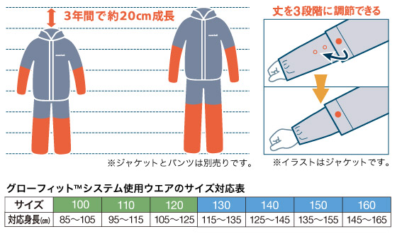 ワンサイズで最大20cmほどの身長差に対応するシステムです。成長の早いお子さまでも長く着用できます。