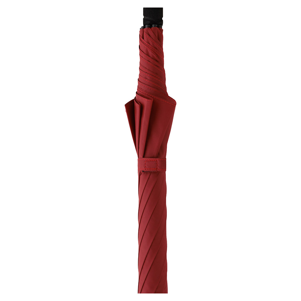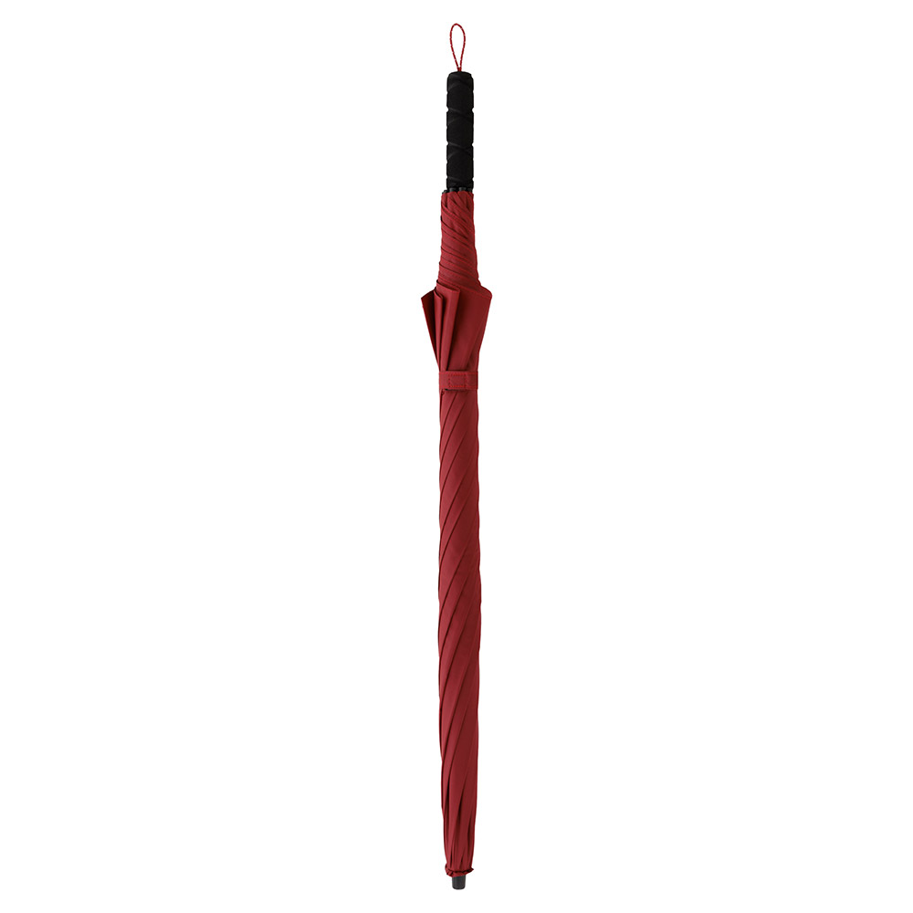 開閉しやすく、折りたたまずに使用する軽量でシンプルな長傘です。収納時に、バックパックのサイドポケットなどに取り付けられるサイズです。トレッキングポールのような形状の握りやすい持ち手。