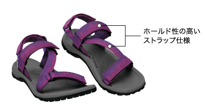 水中の岩肌に対して驚異的なグリップ力を発揮するアクアグリッパーを使用し、水遊びに最適なサンダルです。甲の2カ所と、かかとのベルクロストラップでフィット感の調節が可能。ストラップによるホールド力が高いので水中でも脱げにくく、水辺のアクティビティにぴったりです。