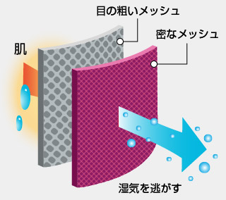外側は小石や砂が入りにくい密度の高いメッシュ、内側は肌離れの良い粗いメッシュを配置する二重構造で、快適な履き心地を実現しています。