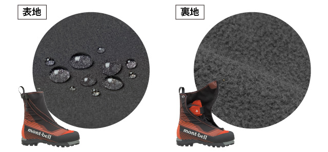 ゲーターには防風性・保温性・ストレッチ性に優れた素材を使用。表地にははっ水加工、裏地には起毛加工を施しています。これにより雪の付着や浸入を防ぎ、内側を保温します。高いストレッチ性は優れたフィット感を生み出し、足首の動きを妨げません。