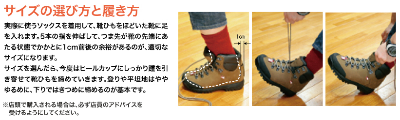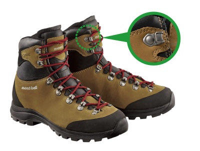 金属製フック(写真参照)を採用している登山靴は、足首内側のフックが反対の靴に引っ掛かり、転倒をまねく場合があります。着用時には必ず靴ひもを一番上まで締めてください。痛みなどの理由で靴ひもを上まで締めずに歩く場合は、特に慎重な足運びをお願いします。