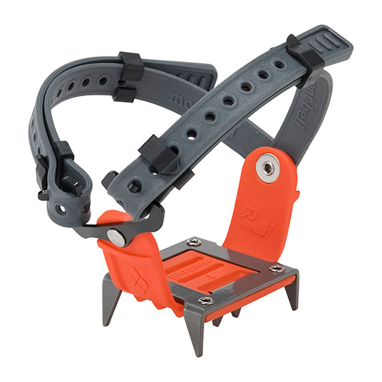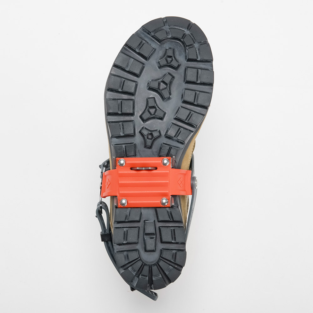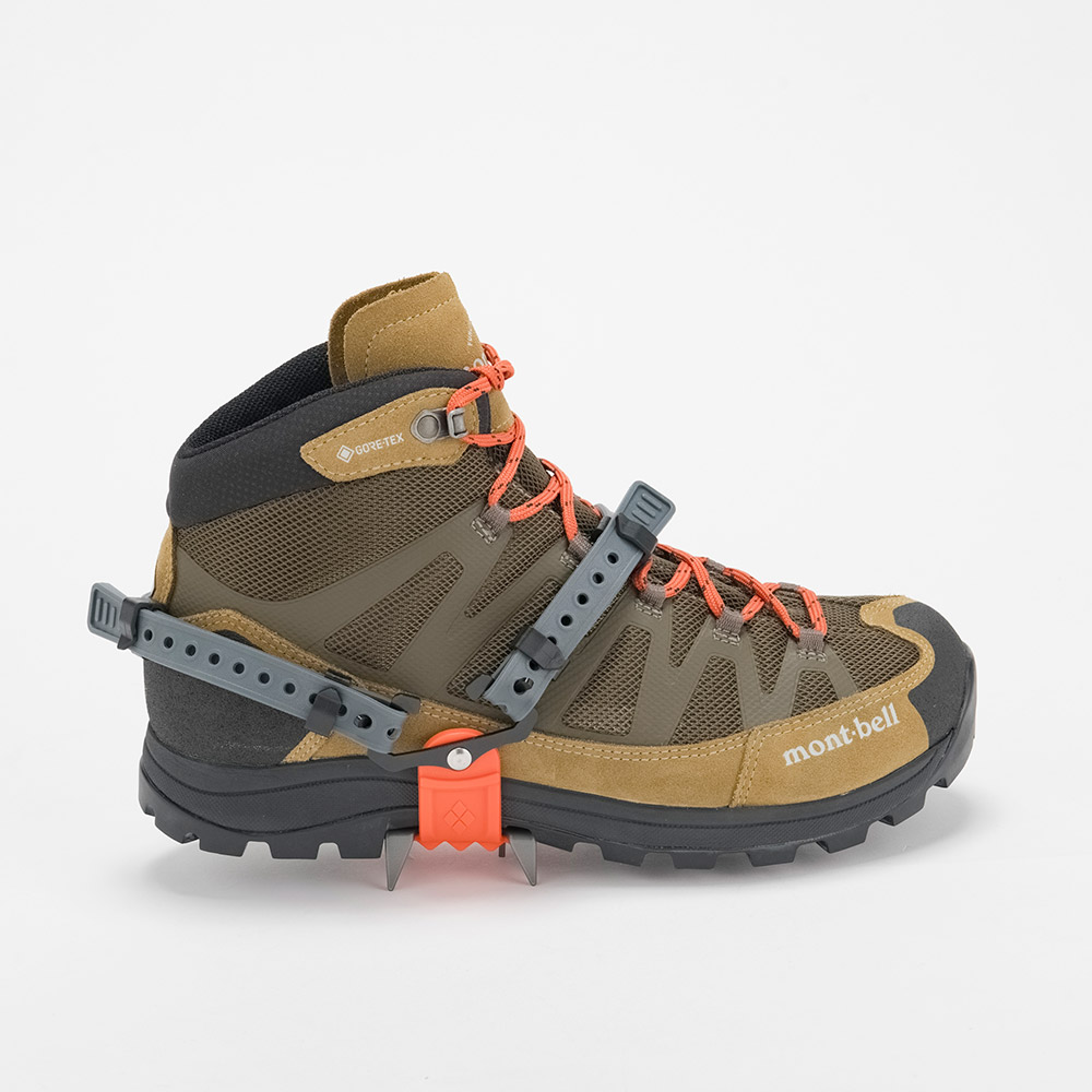 着脱が容易な軽アイゼンです。ハーネス部分は弾力性のあるエラストマー素材で、フィットしやすくズレにくい仕様。子どもの靴から大人の靴まで対応します。スタッフバッグ付き。