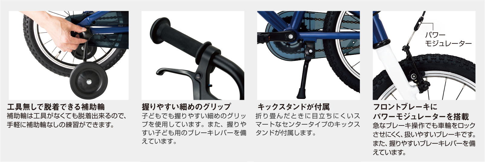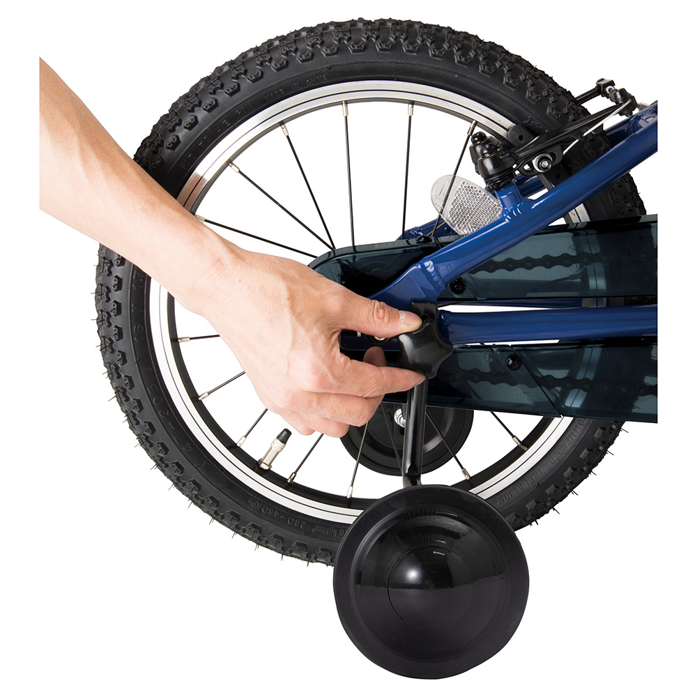 アルミフレームと軽量パーツを使用し7.76kg(ペダル・キックスタンド・補助輪付き)という、子どもが扱いやすい重量を実現しました。足つき性を重視した形状のフレームや握りやすい細めのグリップなど、初めて自転車に乗る子どものための機能を備えています。初めての自転車として標準的なサイズのモデルです。3~6歳用。
