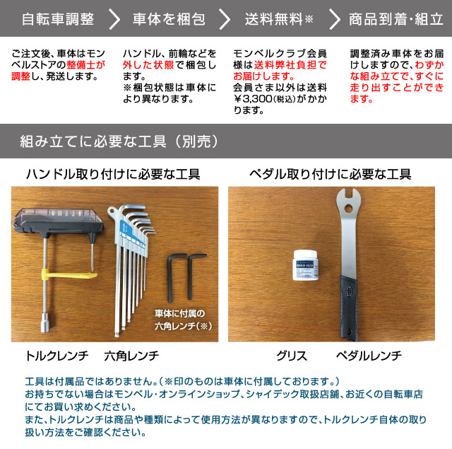 商品ご注文後、弊社より車体の調整、納期(約1~2週間)についてお客様にご連絡します。その後、モンベルストアの整備士が車体を調整した状態で梱包し発送します。