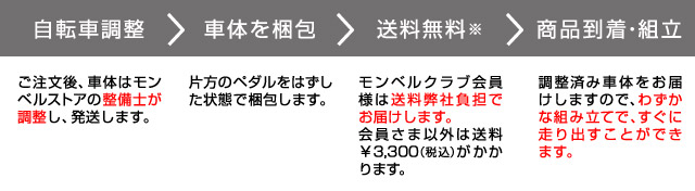 商品ご注文後、弊社より車体の調整、納期(約1~2週間)についてお客さまにご連絡します。その後、モンベルストアの整備士が車体を調整した状態で梱包し発送します。