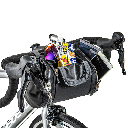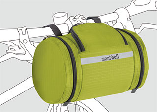 ストラップで容易にハンドルバーへ固定できるフロントバッグです。メイン荷室には行動食やレインウェア、小物などが入れられる容量を設け、サイドポケットは予備のチューブなどが収まるサイズに設定。ツーリングから街乗りまで幅広く対応します。夜間、車のライトなどを反射して光るプリントが視認性を高めています。※装着する場合は、レバーの動きに干渉しないことをお確かめください。