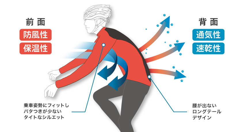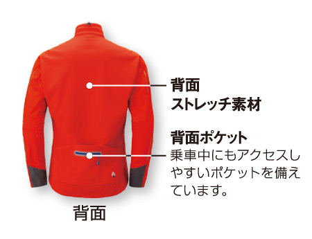【特長】ポケット5個(ジッパー付き〈胸1、背面1〉、ジッパーなし〈背面3〉)【機能】すそずり上がり防止テープ/反射テープ/反射ロゴ/立体裁断(ひじ)/ジッパーがあごに当たらない仕様/ネックアジャスター/ストレッチカフ/サムループ/ポケッタブル・デザイン
