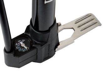 安定したポンピングが行えフットペダル付き。フットペダルを起こすとポップアップする空気圧計を備えています。
