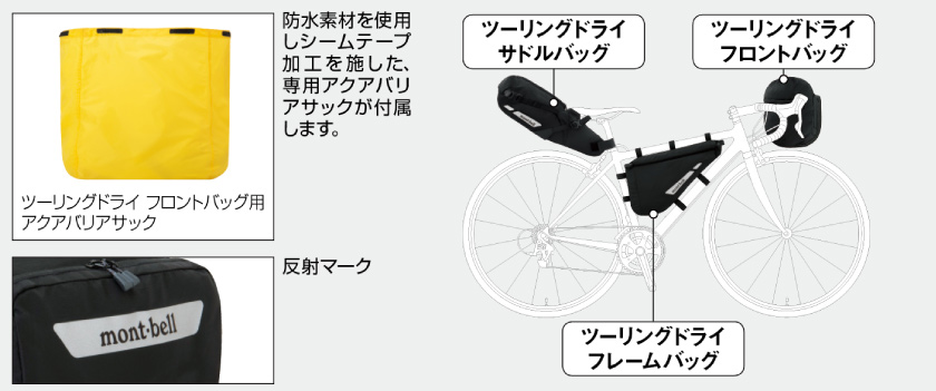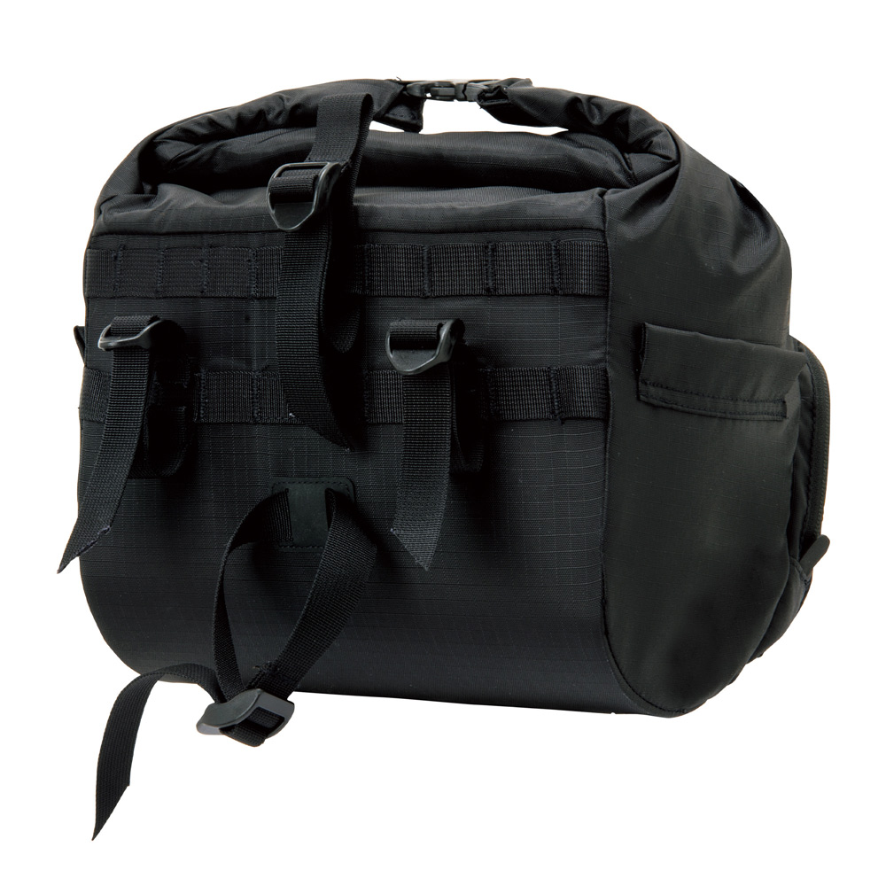 アクセスしやすいフロント部に装着するバッグです。本体内部には形状を安定させる芯材を内蔵。フロントポケット内部には、スマートフォンなどの収納に適したストレッチポケットを装備しています。付属のテープを使用してハンドルに取り付けます。また、別売の「フロントバッグマウント」「フロントバッグフレーム」を使用して取り付けることで、ワンタッチで着脱できます。