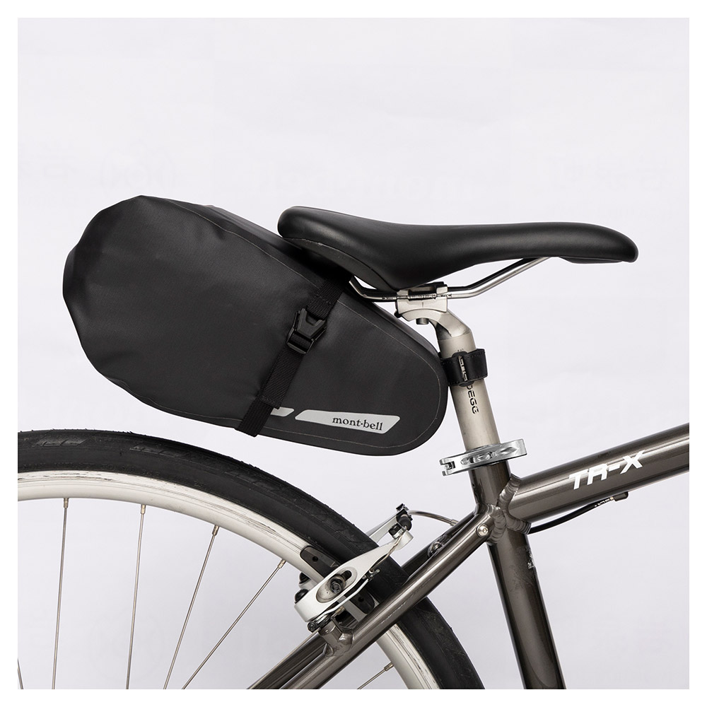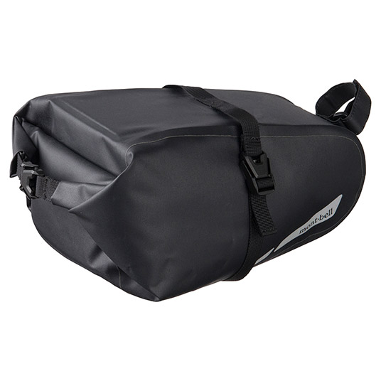 出し入れ口を折り返してバックルを留める気密性の高い仕様で、工具類など、濡らしたくないアイテムの収納に適したサドルバッグです。シートピラーにベルクロテープを巻き付け、サドルレールにバックル付きベルトを留めるだけで簡単に装着することができます。車のライトなどを反射して光るプリントを施し、視認性を高めています。