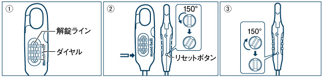 ②リセットボタンを小さいマイナスドライバーなどで反時計回りに150度回転させて、新しい3ケタの解錠番号を解錠ラインにそろえます。