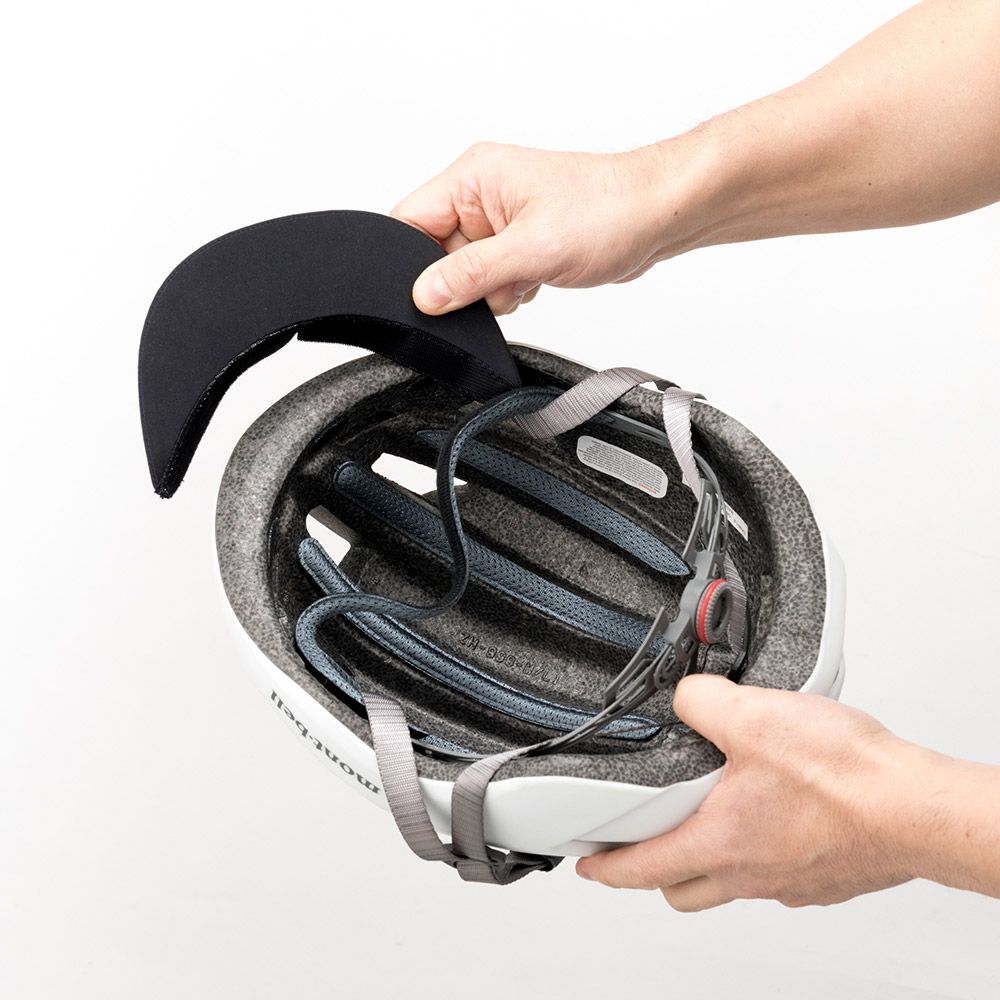 【特長】ヘルメットのフロントインナーパッドとヘルメットの間にベルクロで挟み込む仕様