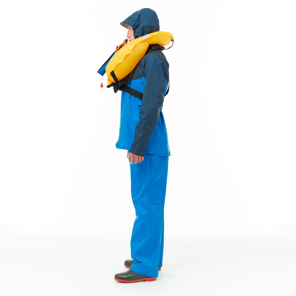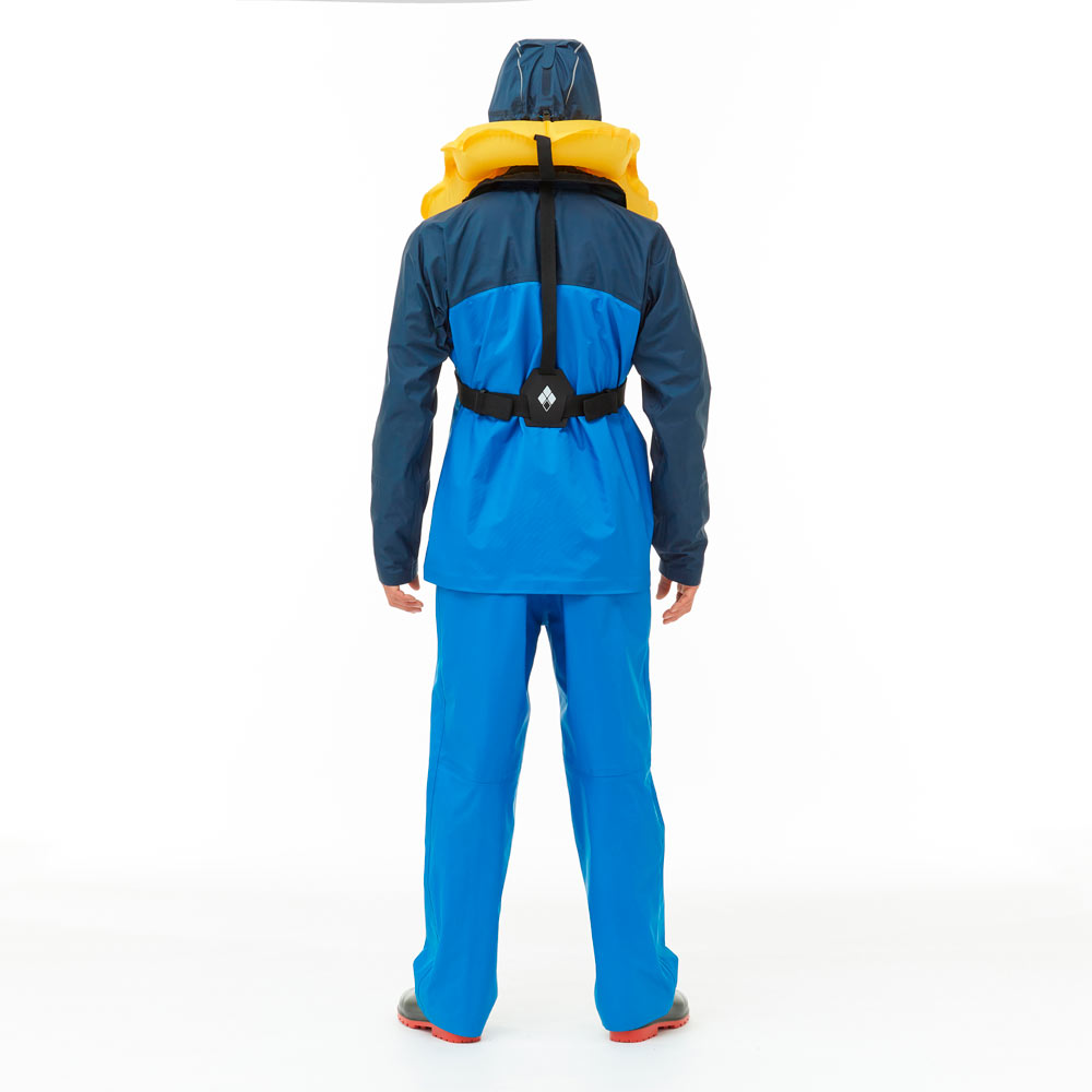 作業用救命衣(小型船舶用救命衣兼用)として使用する、軽量で動きやすい肩かけタイプの膨脹式ライフジャケットです。本製品は桜マーク(TYPE A)付きです(※)。着水感知センサーによる自動膨脹と手動による膨脹の2通りの方法で作動します。自動膨脹は補助的な機能で、手動膨脹を基本操作として使用します。浮力体は落水した時の安定感に優れ、保護カバーの生地の表面はコーティングしているので、汚れがつきにくい仕様です。一度膨脹させても、ガスカートリッジを取り換えれば繰り返し使用することができます。