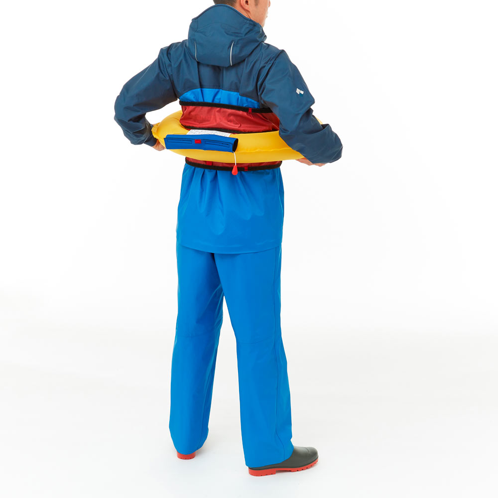 作業用救命衣(小型船舶用救命衣兼用)として使用する、軽量で動きやすい腰巻きタイプの膨脹式ライフジャケットです。本製品は桜マーク(TYPE A)付きです(※)。着水感知センサーによる自動膨脹と手動による膨脹の2通りの方法で作動します。自動膨脹は補助的な機能で、手動膨脹を基本操作として使用します。浮力体は落水した時の安定感に優れ、保護カバーの生地の表面はコーティングしているので、汚れがつきにくい仕様です。一度膨脹させても、ガスカートリッジを取り換えれば繰り返し使用することができます。