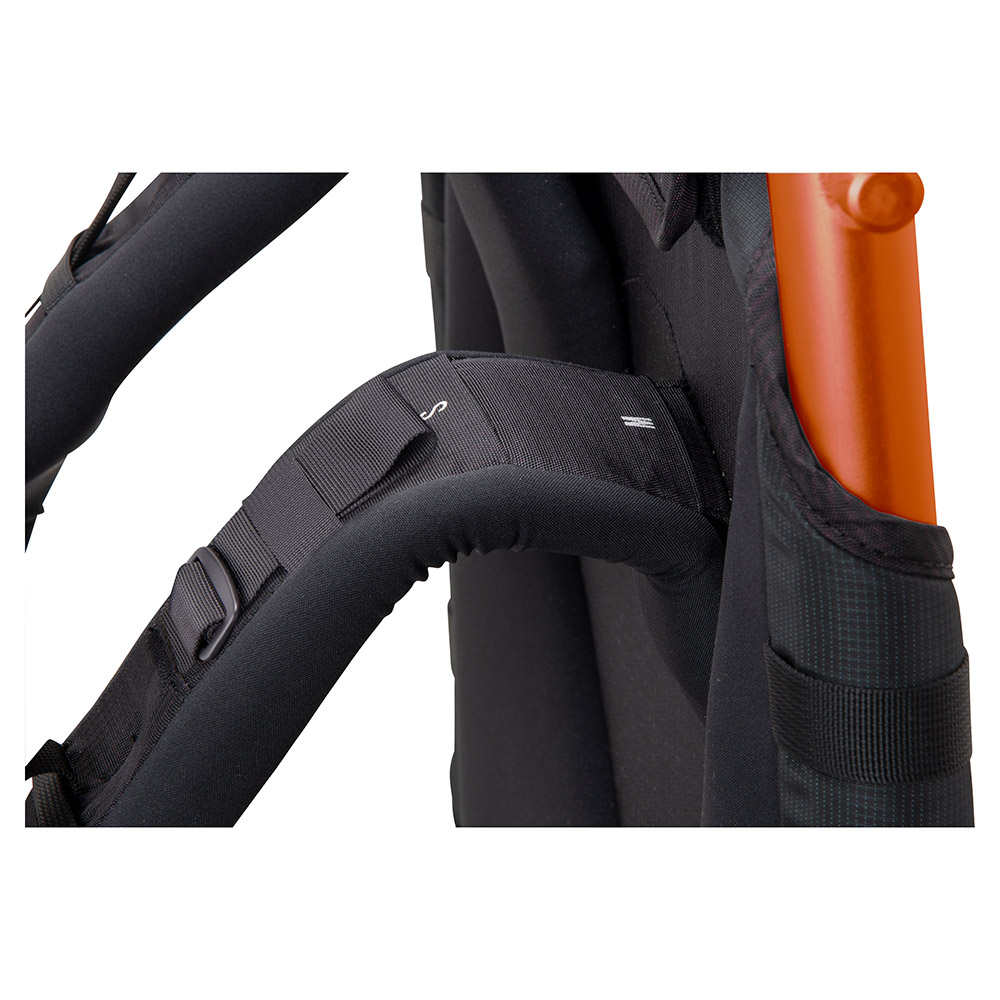 ご自身の背面長に適合するショルダーハーネスのポケットに本体側のプレートを奥まで差し込み、テープを引いて固定します。