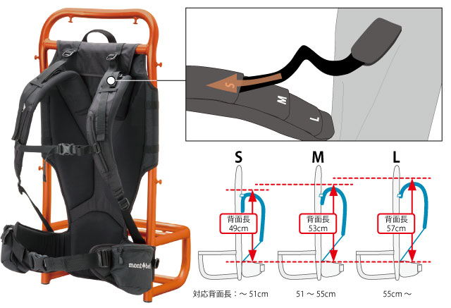 ショルダーハーネスは、S:~51cm/M:51~55cm/L:55cm~の背面長に対応します。